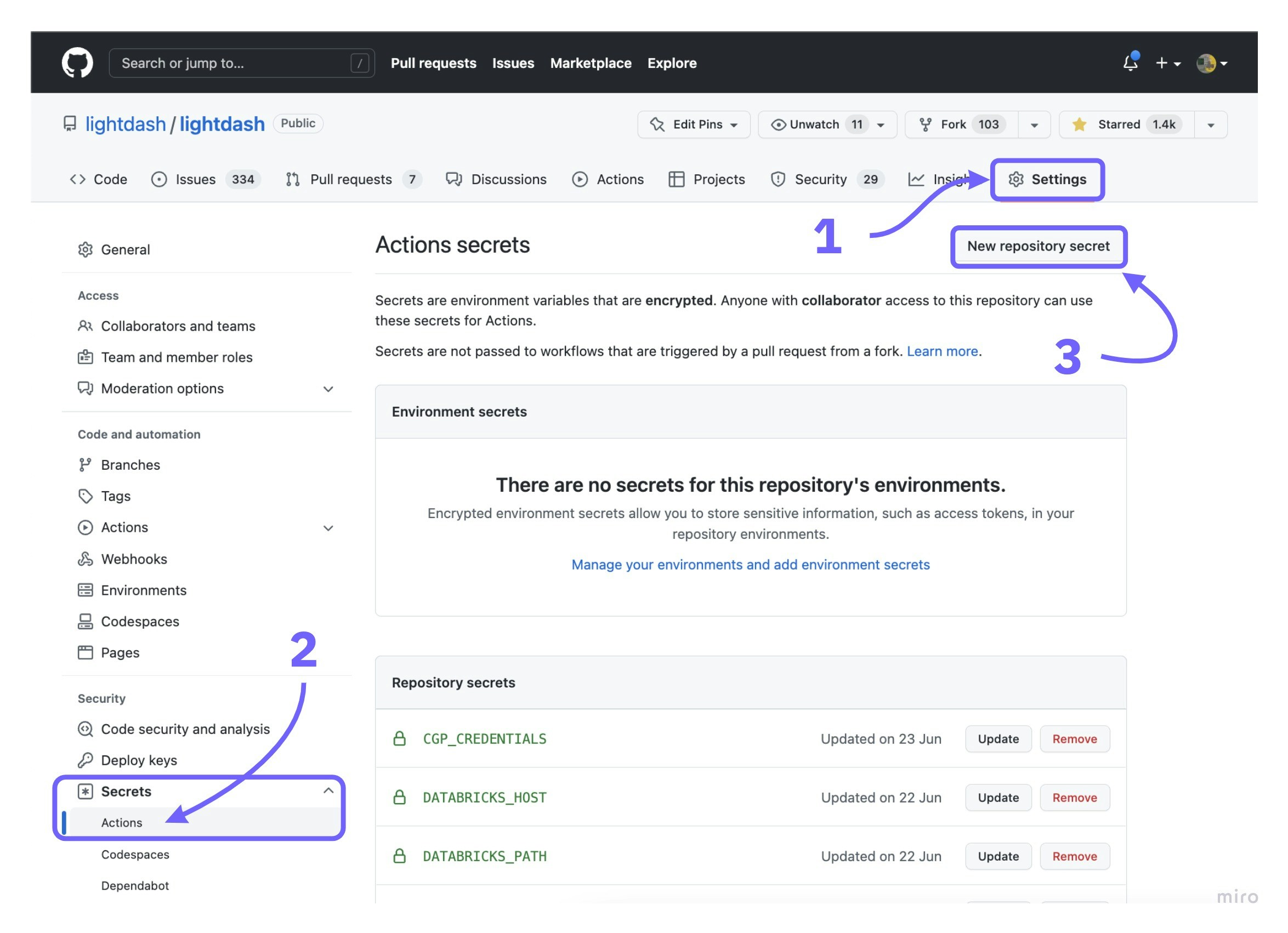 We are going to add some secrets and config to GitHub actions, but you don’t want those to be public, so the best way to do this is to add them as secrets on Github.If you already have a GitHub action for Lightdash, then you can use the same Lightdash secrets you created for your other action.