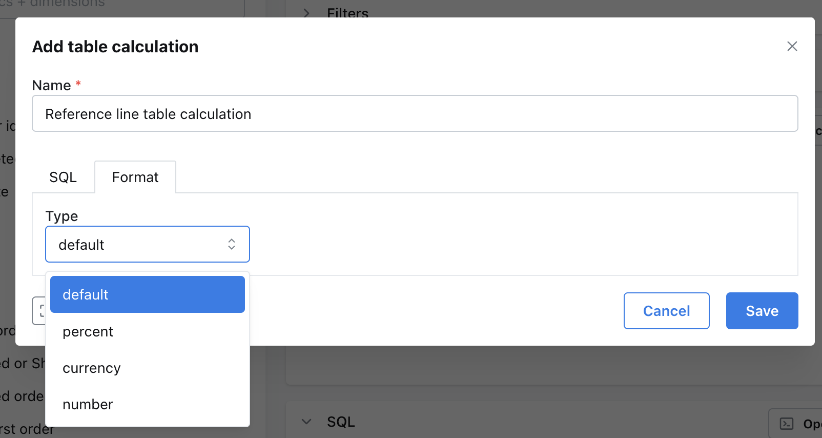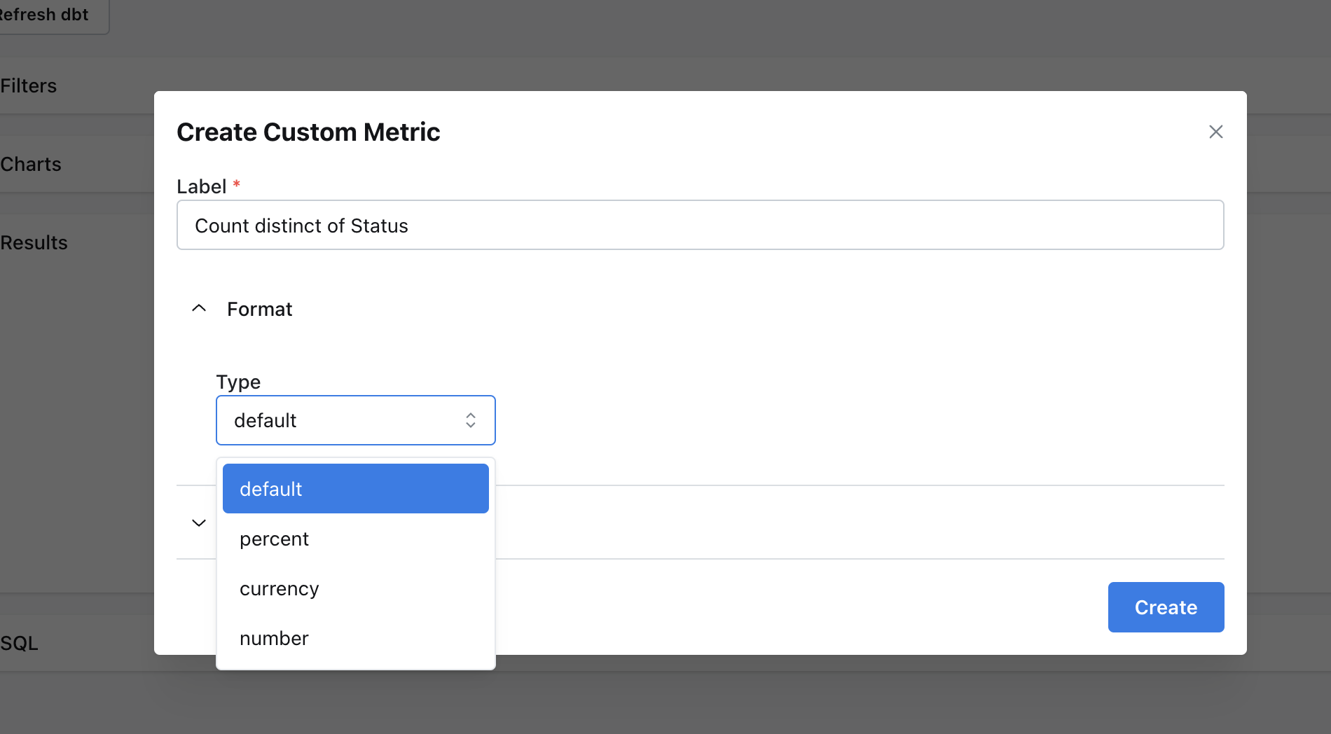 You can also format your fields in the Lightdash UI. This is useful if you want to format your fields quickly without having to change your YAML files. Currently you can format 2 types of fields in the Lightdash UI:Formatting metrics