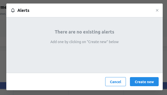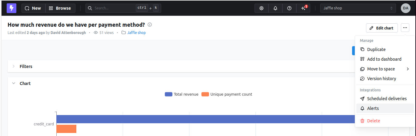 Only users with admin, developer or edit access can create alerts. To create an alert, click on the three-dot menu in the top-right corner of your chart, then click onAlerts.