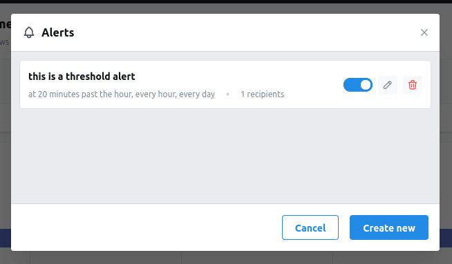 To edit an alert, click on the pencil-icon next to the alert you want to edit. This will bring you back to the configuration screen for your alert, where you can make any changes you’d like. In case you want to delete a alert, click on the trash-icon next to the alert you want to delete.