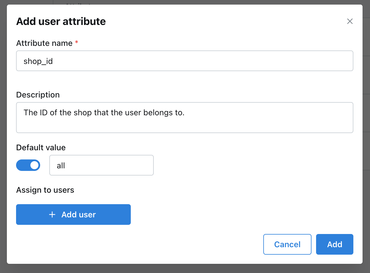 First, we need to create a user attribute in Lightdash that we can use to assign our users to a specific shop. I create an attribute calledshop_id and I set the default value to all.