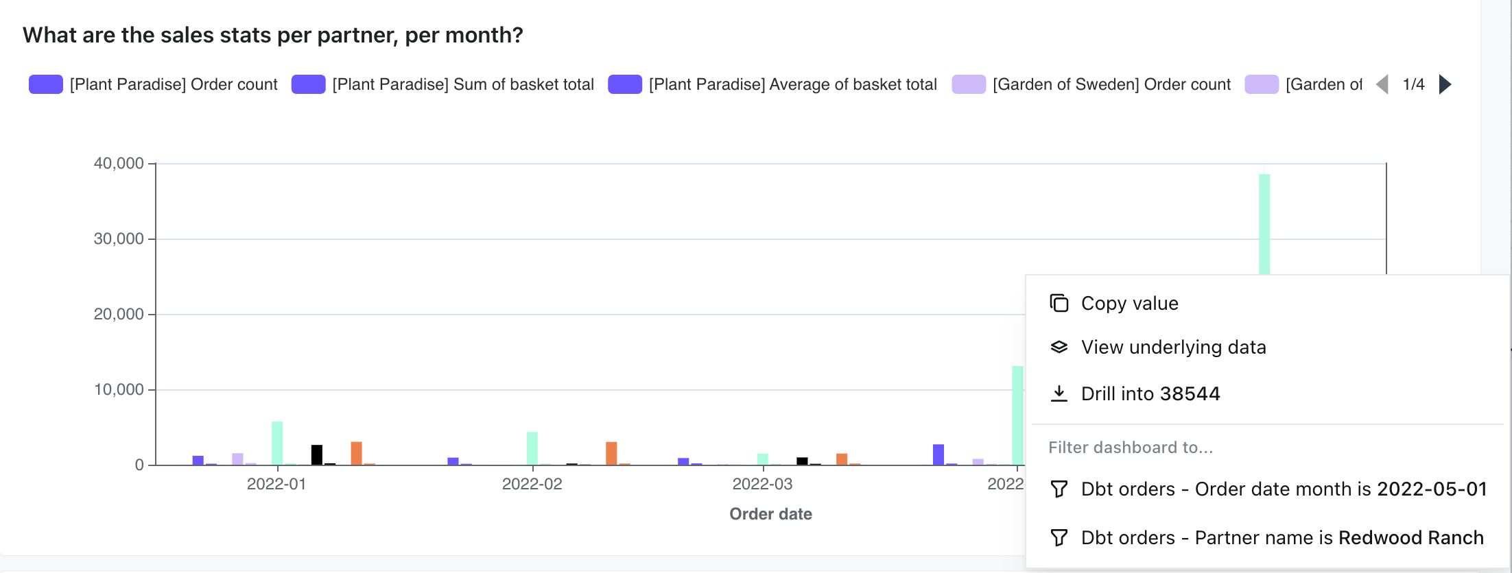 I have a chart with Sum of basket total (a Metric) per Partner, per month. As you can see, there’s a high spike in sales for one of the partners in the month of May. I want to understand why this spike happened. To do this, I click on the data point in my chart, then clickDrill into in the action menu: