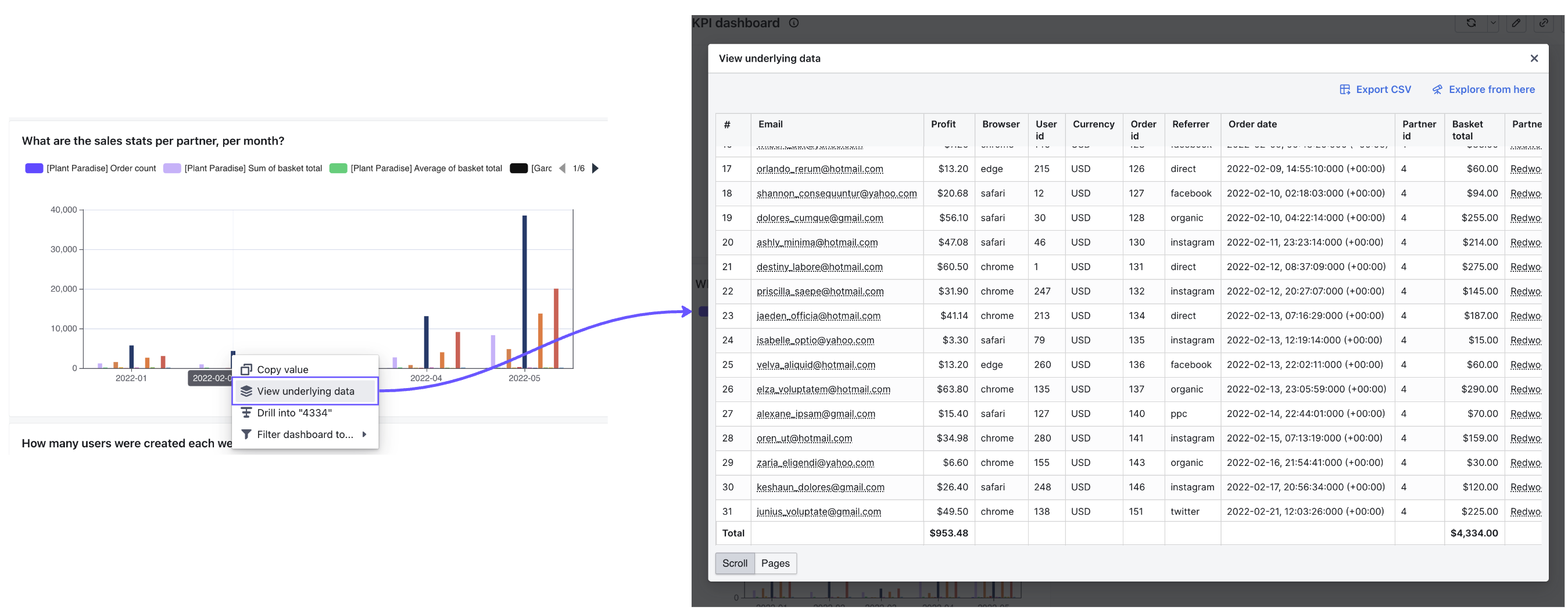You can click on any point on a chart and view the records which make up that data point. For example, I can find out what the underlying data is for the $4,334.0 in myWhat are the sales stats per partner, per month? chart, by clicking on the bar for that month, and then clicking View underlying data in the action menu. I’d see all of the rows in the underlying table that make up that total.