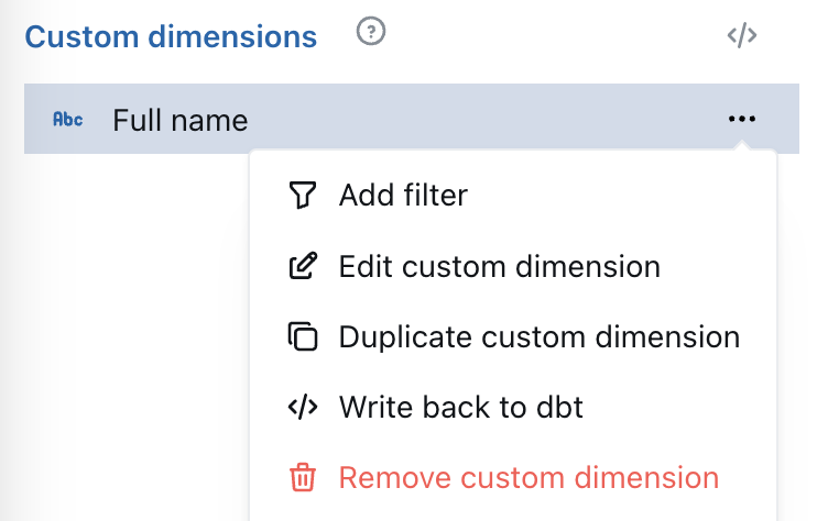 At the moment, if you write back a Custom Dimension to your dbt project’s YAML, the Custom Dimension will not be automatically replaced with the new YAML Dimension. Once your new Dimension is created in dbt, you’ll need to manually update your charts and replace the Custom Dimensions with the new Dimension.Write back dbt Models from the SQL Runner