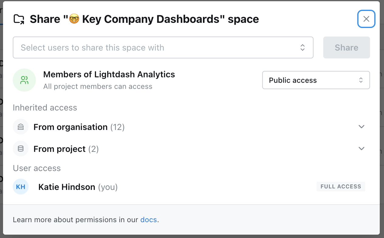 Everyone who has access to your project has access to a Public space. For example, here I have a Space with Public access. Everyone who has access to my Project, “Lightdash analytics”, will get access to the content in my public space.