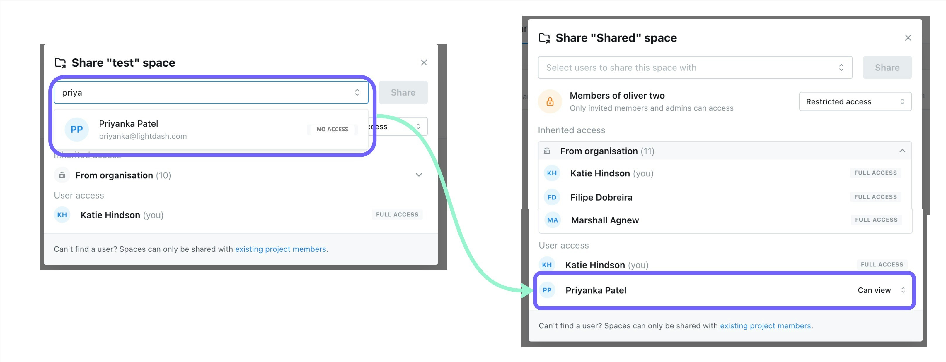 editor in my project, they will have Can Edit permissions in my Space. If someone is a viewer in my project, they will have Can View permissions in my Space. For more details about actions you can take in a Space based on your role, check out this table.