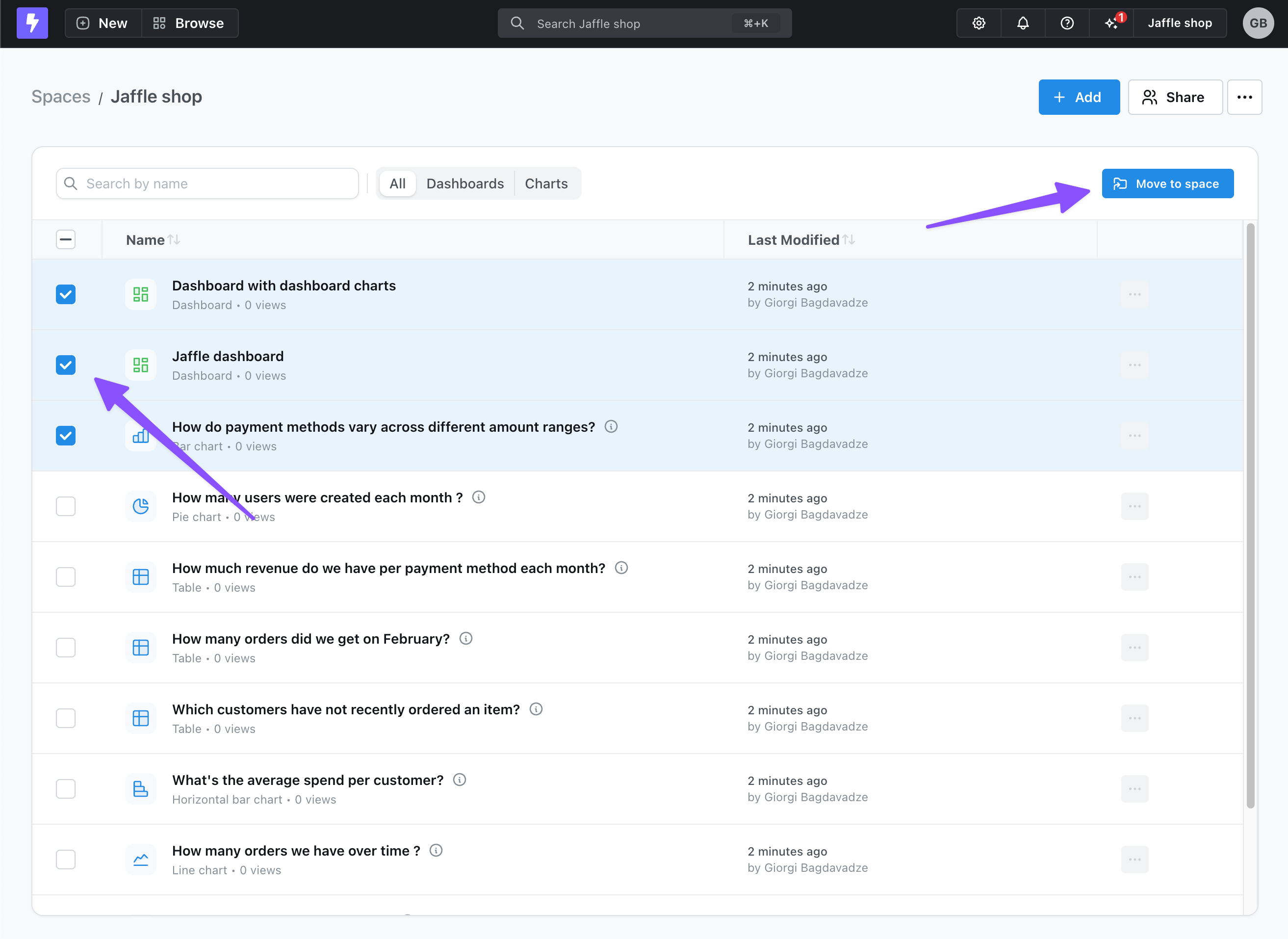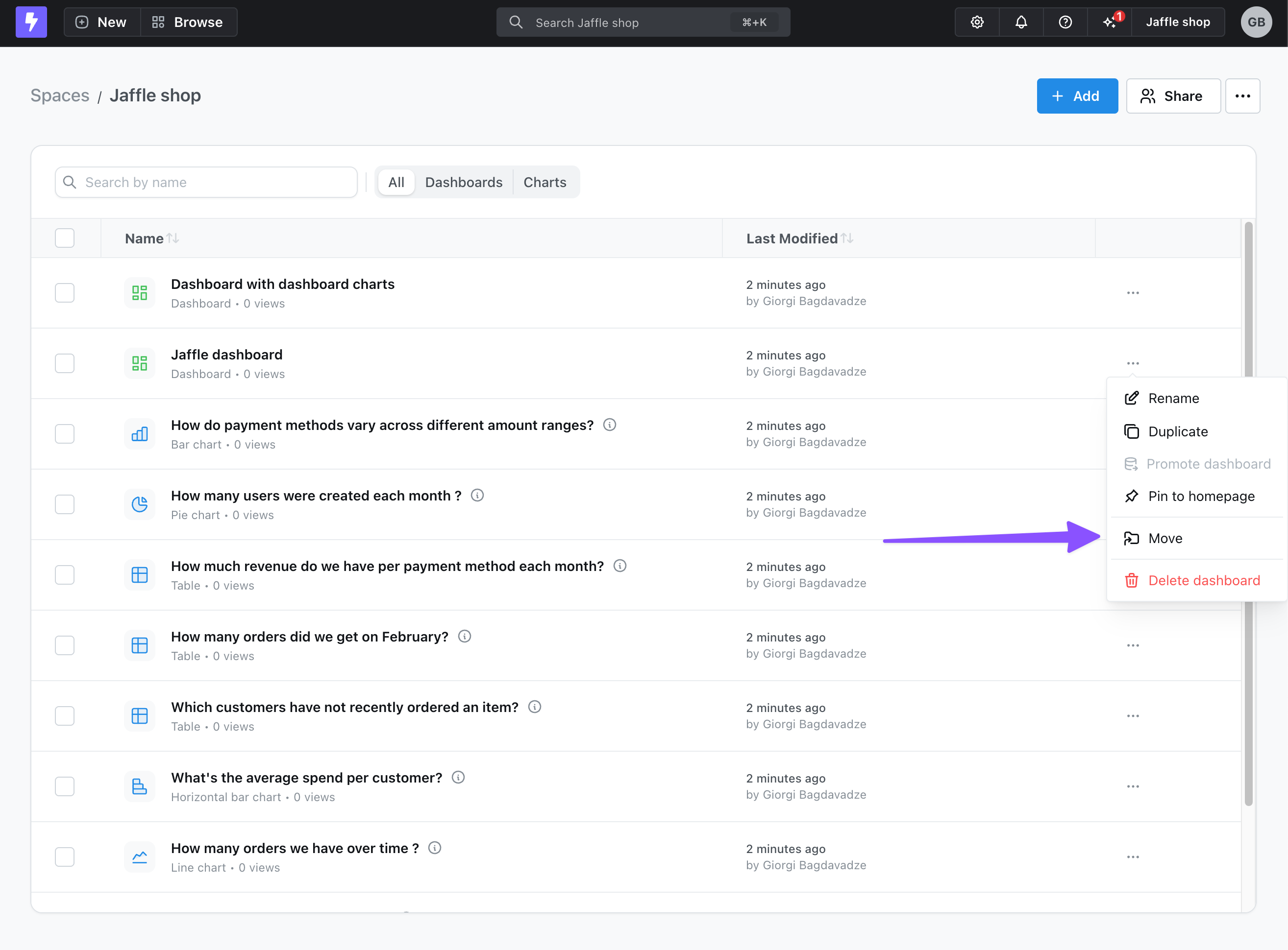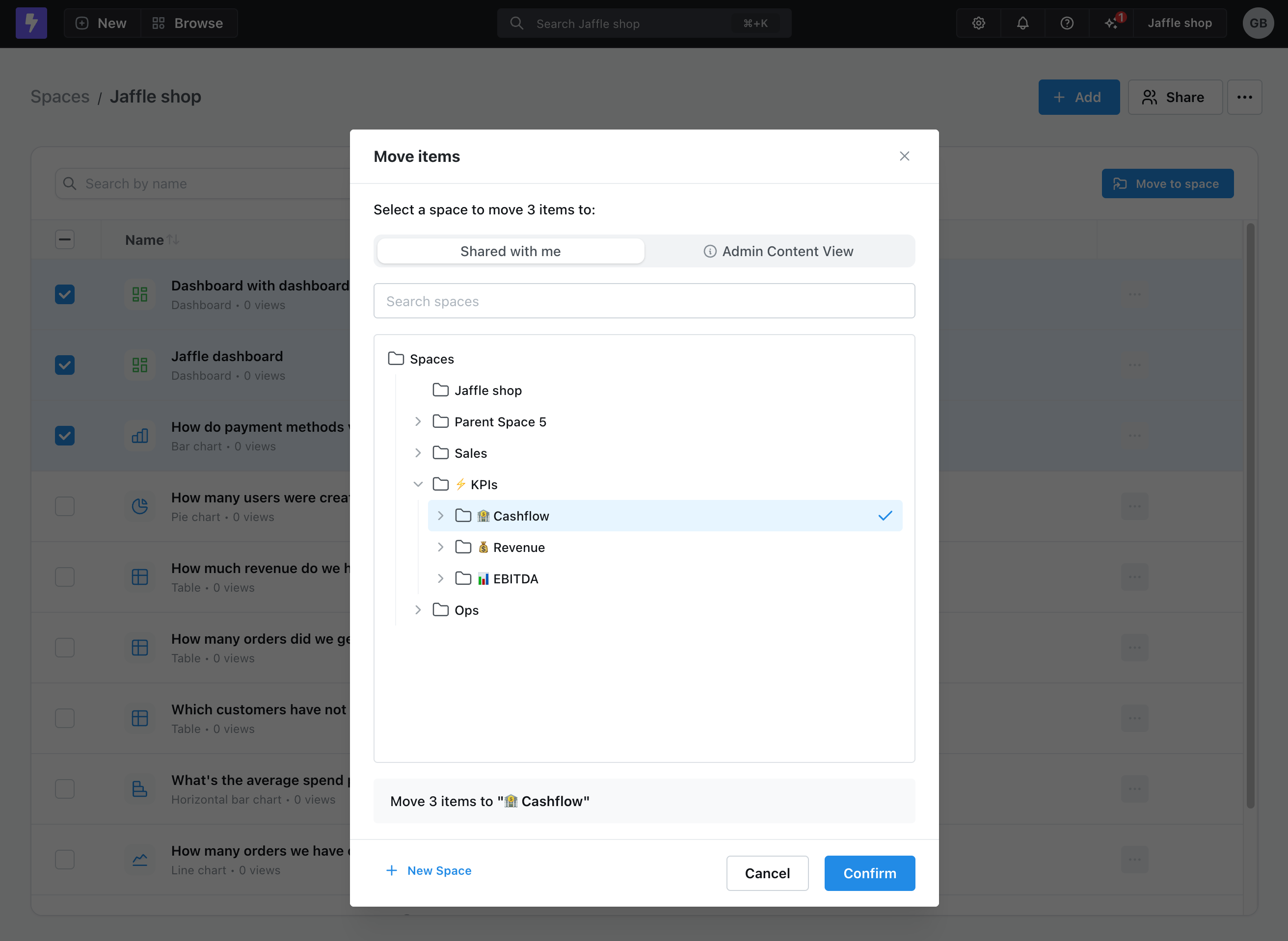 To move a saved chart, dashboard or space between Spaces, you can click on the three dot menu (...) to the right of the item and pick the Move action. Or select items using checkboxes on the left and click Move to Space.