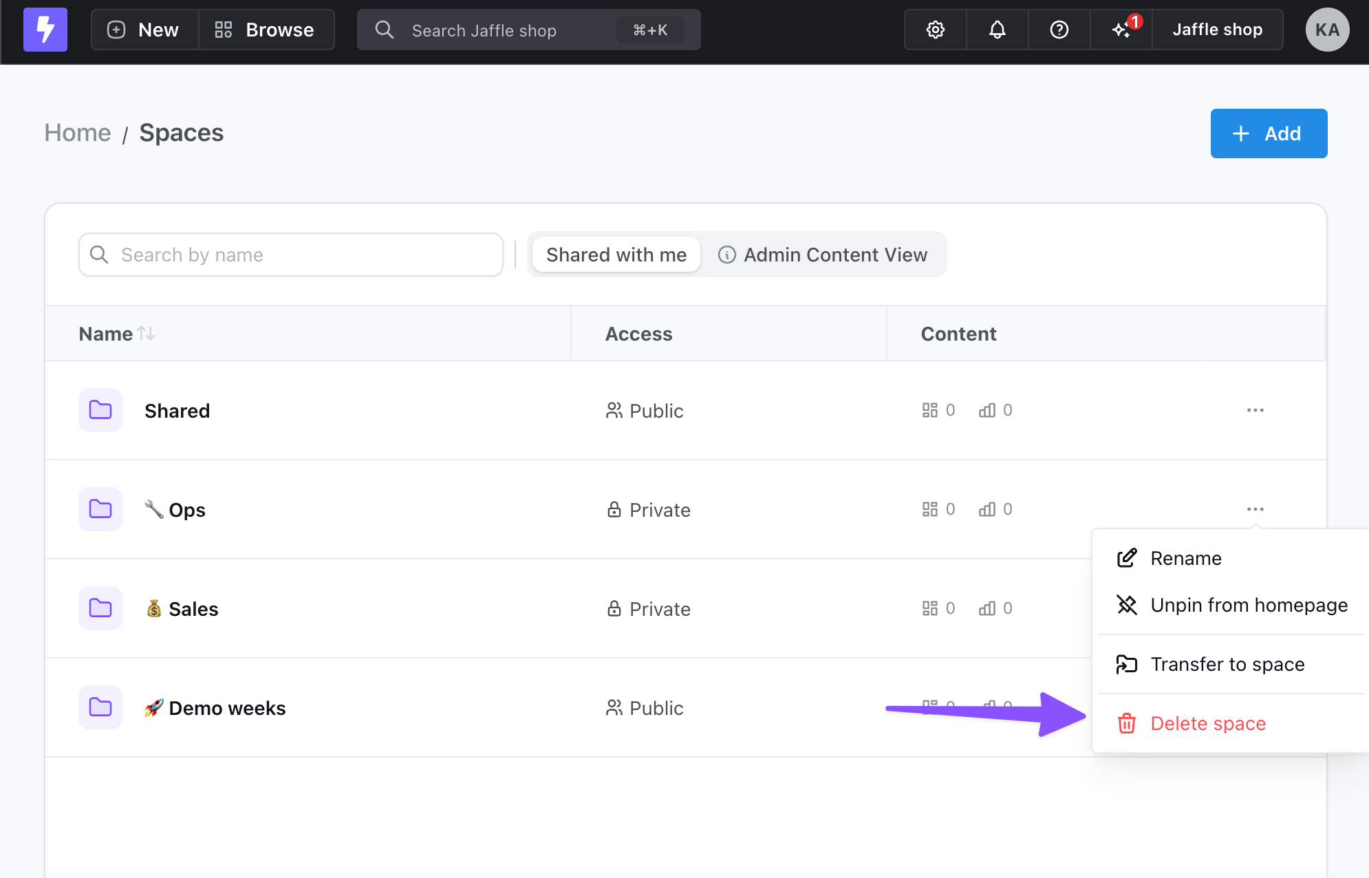 You can rename or delete your Space from All Spaces view or on the homescreen by clicking on the three-dot menu (...) for the Space.