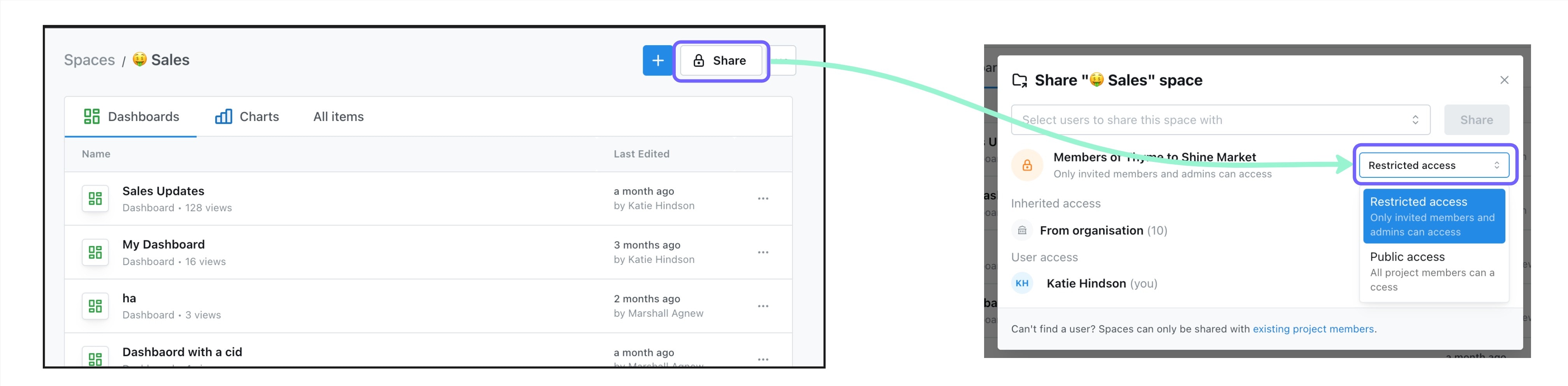 By default, when you create a Space, it is restricted so only you can access it (however, if you create a nested Space, it automatically inherits permissions from its parent). You can edit a Space to make it Restricted Access or Public Access. To edit access to a Space, navigate into the Space, then click theshare button. From there, you can choose to make a space Restricted Access or Public Access (Only top level space access can be edited, nested spaces inherit permissions from their parent spaces).