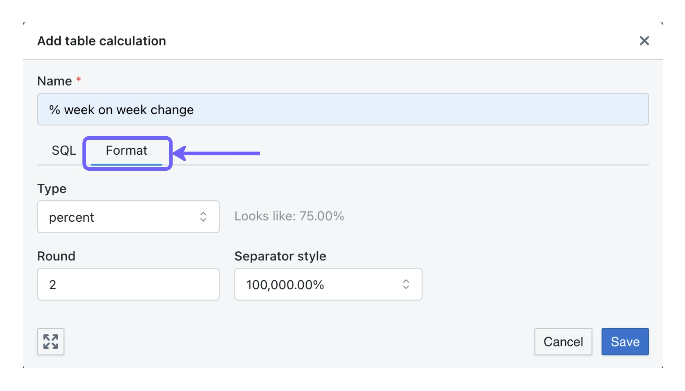 If needed, you can update the format of your table calculation to things like percent formatting using theformat tab.