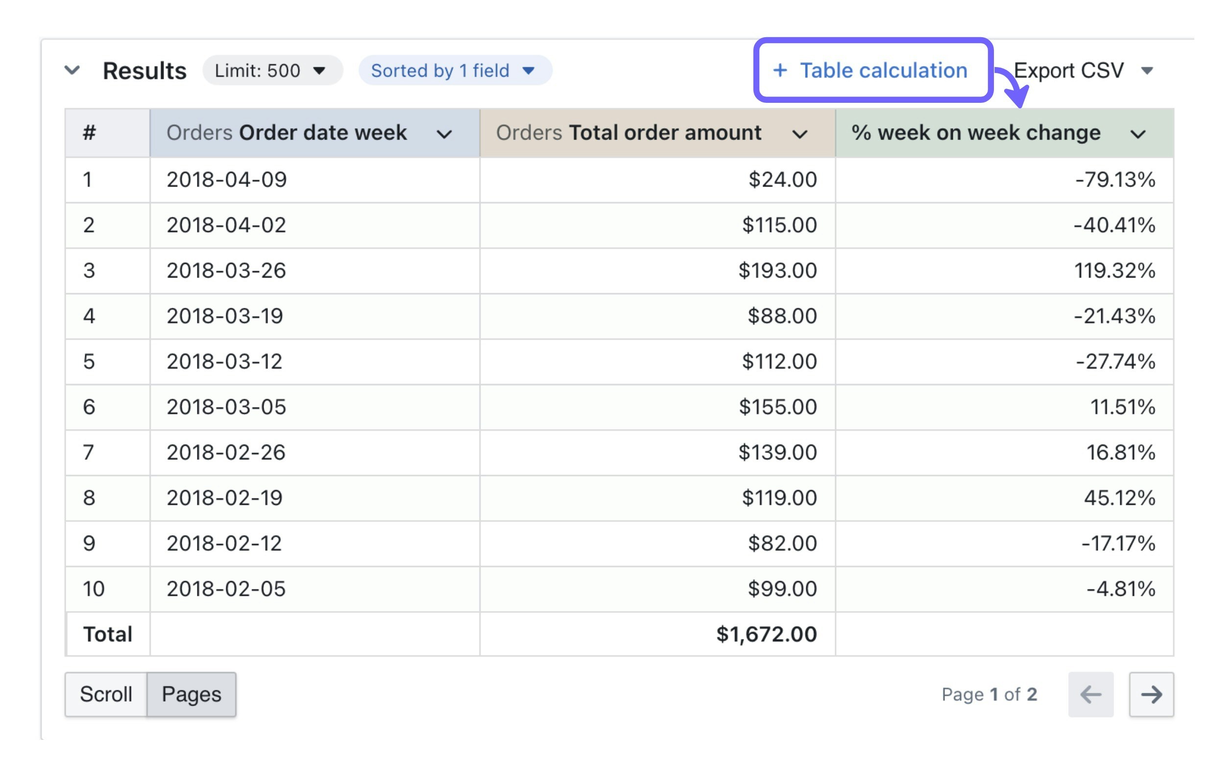 Since all calculations are performed before filtering, table calculation filters only hide rows without affecting the underlying calculations. For example: You use table calculations to calculate thepercentage_of_shipping_method_amount, then filter to hide rows below 30%. The filtered rows (shown in purple) will disappear but the percentage_total calculation still shows 100% even though the visible percentages in the percentage_of_shipping_method_amount column no longer add up to 100%.